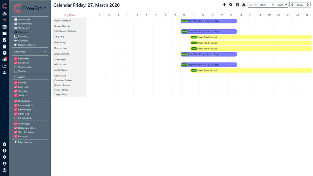 Mit den verschiedenen Kalenderansichten in CrewBrain behalten Sie auch bei einer großen Anzahl an Veranstaltungen stets die Übersicht. Neben Jahres-, Monats-, Wochen- und Tagesansichten stehen auch Ansichten für die Verfügbarkeit der Mitarbeiter und die jeweilige Urlaubssituation zur Verfügung.