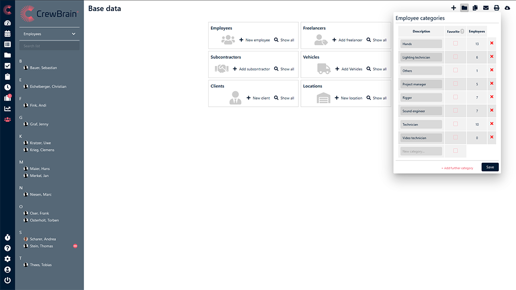 Pour que vous puissiez toujours trouver le bon personnel dans les plus brefs délais, vous pouvez - en outre des informations sur vos employés - également attribuer des catégories libres à vos employés et les attribuer à ces catégories. Chaque demande vous donne un accès rapide à tous les employés d'une catégorie spécifique.