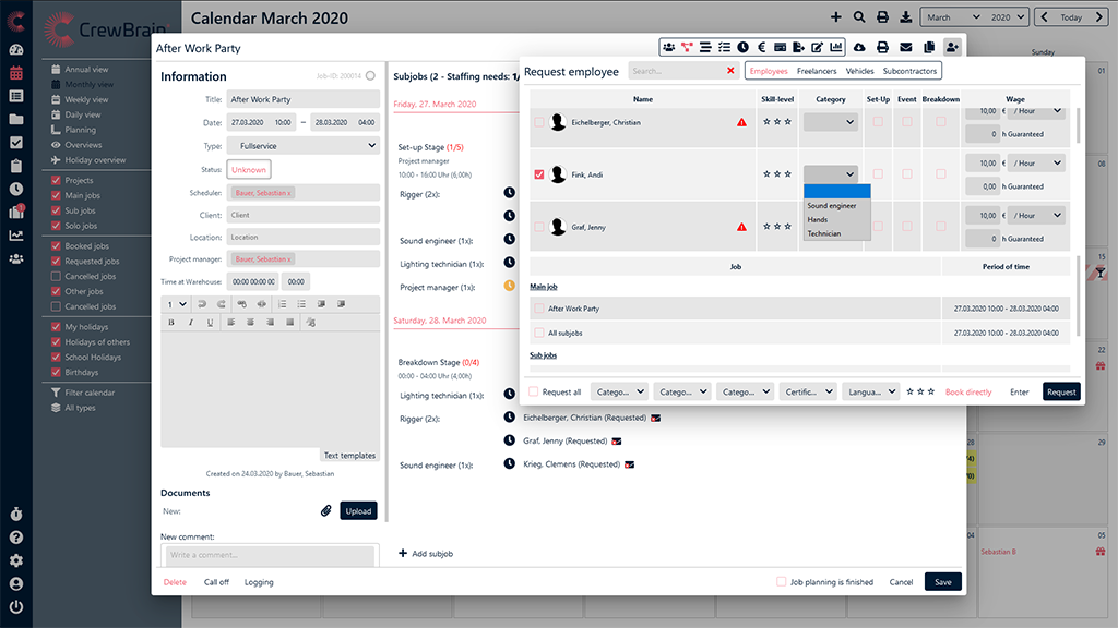 Vous ne voulez pas toujours immédiatement capturer tous les employés avec lesquels vous travaillez dans un logiciel. Cela est particulièrement vrai pour, par exemple, les employés qui vous aident temporairement. Dans de tels cas, CrewBrain vous permet de saisir des employés indépendants (de simples champs de texte pour indiquer l’employé) lors de la demande. Vous pouvez également saisir la disponibilité de ces employés pour l'événement en question directement dans CrewBrain.
