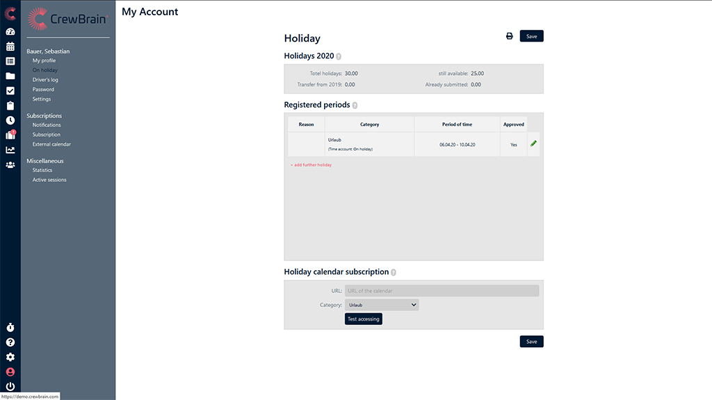 Dans tous les tarifs avec une administration de vacances étendue, CrewBrain gère non seulement les périodes de congés de vos employés, mais enregistre également des jours déjà pris et toujours disponibles - et ceci par année civile. Sur la base des jours de travail hebdomadaires, un compte de congés est automatiquement géré en arrière-plan, lequel peut être récupéré à tout moment par l'employé et les administrateurs.