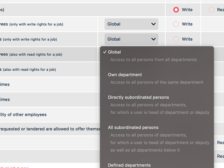 Extended scopeThe scope of a right (own department, subordinate employees, etc.) can now also be assigned for entire departments, locations or staff categories. Which exactly are relevant can be defined at the very end below the different rights, here also a multiple selection is possible in each case. |