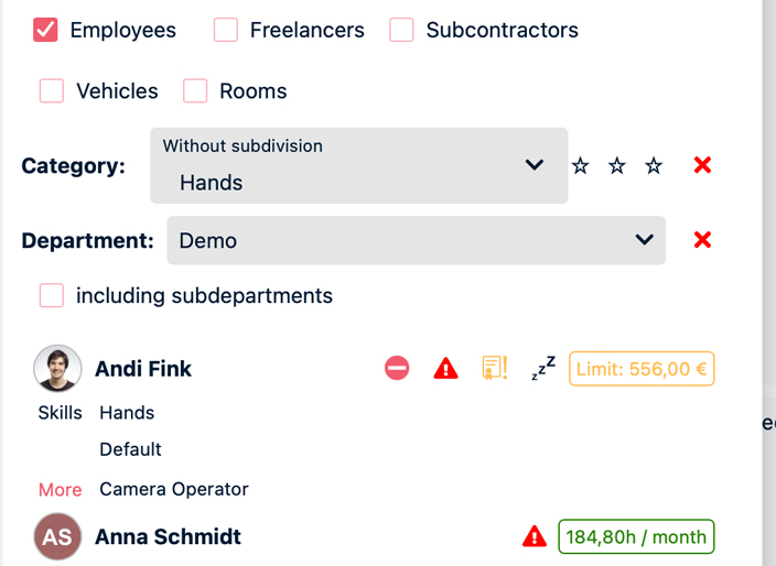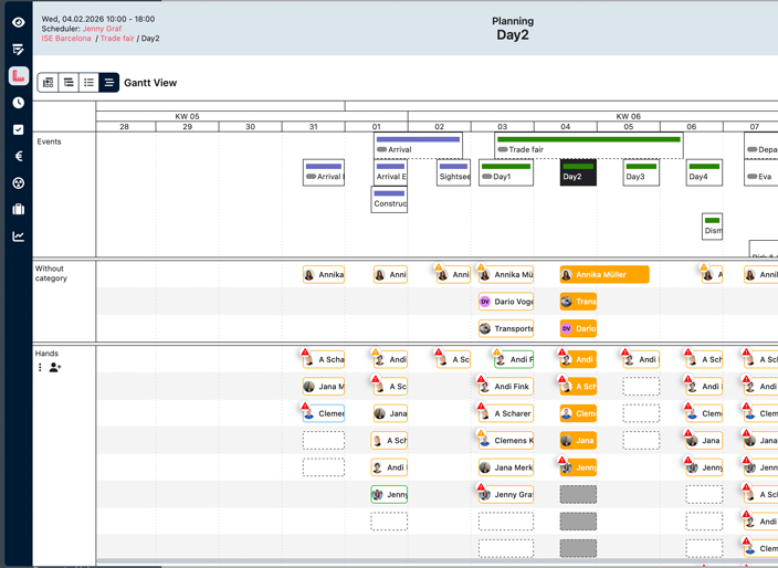 PlanungsansichtenEiner der wichtigsten Bestandteile des neuen Dialogs sind die Planungsansichten. Diese haben wir von Grund auf neu entwickelt und können darüber künftig viele Features anbieten, die sich unsere Kunden schon lange gewünscht haben. So ist es künftig zum Beispiel möglich, direkt aus den Planungsansichten heraus die Einsatzzeiten der Mitarbeiter & Freelancer per Drag & Drop zu verändern. |